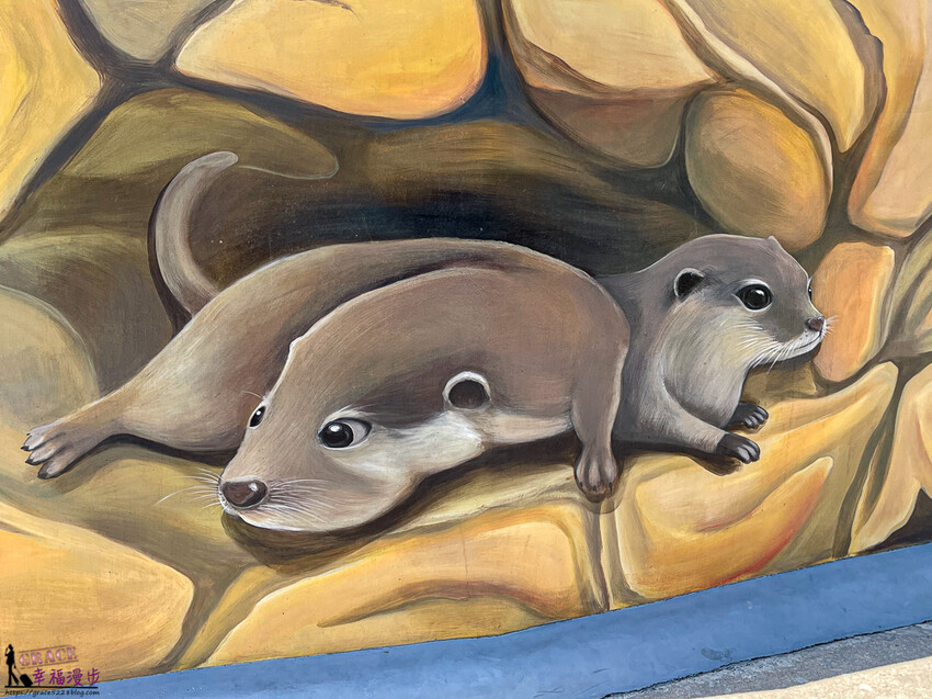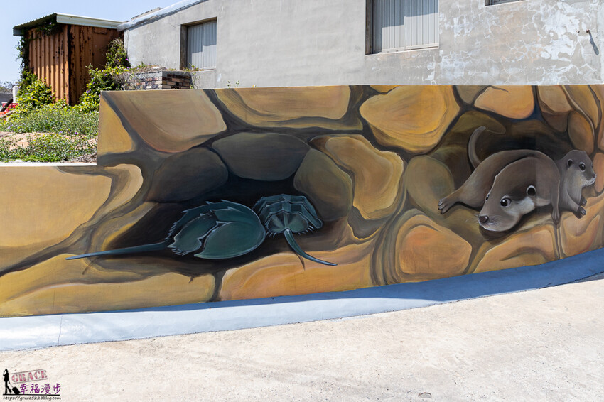 金門的水獺跟鱟都是當地特有的生物,也出現在彩繪牆上,旅客有機會可以在金門島嶼看到牠們。