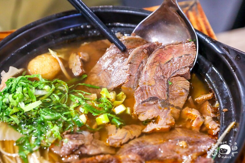 牛腱肉切薄入味,這份招牌牛肉鍋選了小辣湯底,入口的麻開胃,辣度在尾韻散開,高湯以雞骨熬製,加上郫縣豆瓣炒製後的鍋底再經過過濾,並加入多種中藥和香料提味,湯頭清澈不油膩。
