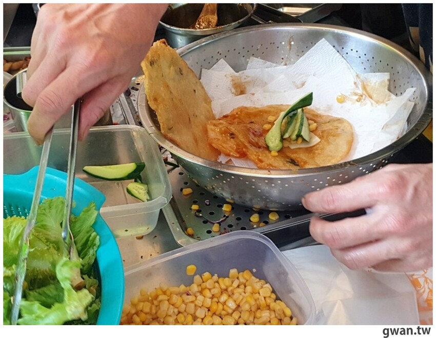 問了老闆,最多人點的是雙拼捲餅,主菜有德式香腸+鱈魚條!還搭配了各式蔬菜、泡菜、醃白蘿蔔…等等,拿在手上超大份,蔬菜也平衡了炸物的油膩感,尤其泡菜跟醃白蘿蔔,吃起來酸酸甜甜超開胃