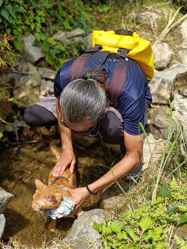所以沿路遇到山泉水就將他身體及腳蹼打濕!用來降溫之用!