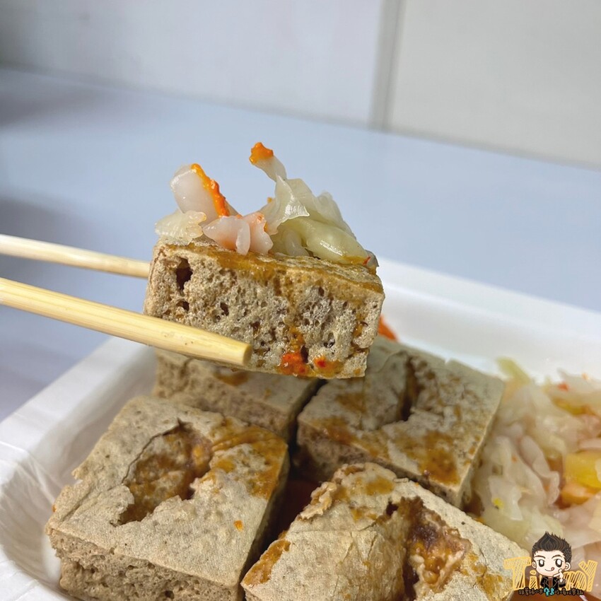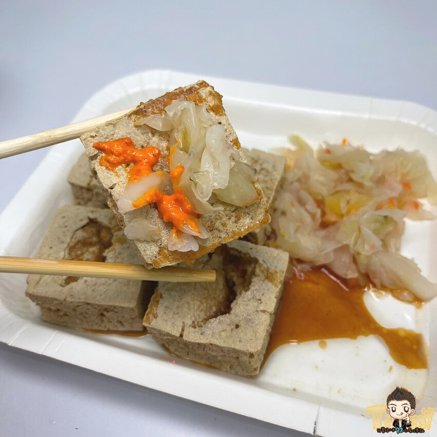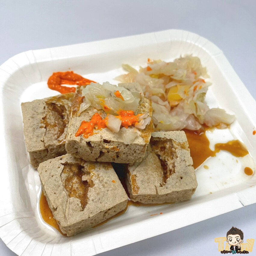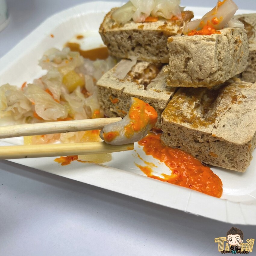 一份有五塊臭豆腐,每塊的厚度都夠厚,搭配店家特製的台式泡菜和辣椒,就是小米最念念不忘的美味