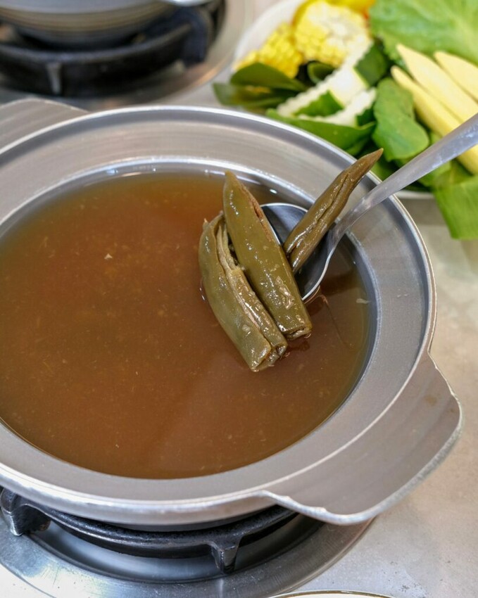 ▼看起來黑嚕嚕的剝皮辣椒鍋,加入大量的剝皮辣椒本人,清爽鮮甜還帶有回甘餘味,辣度偏低不會過於刺激