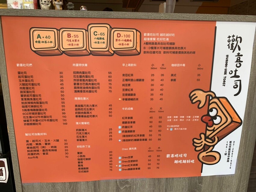 位在大馬路上的歡喜吐司有著可愛的顯眼招牌,致力成為一家新莊最有趣、 專門賣吐司的早餐店店家,老闆非常有創意,結合許多idea,推出很多不同肉蛋吐司的口味,各式創意的肉蛋吐司超迷人!