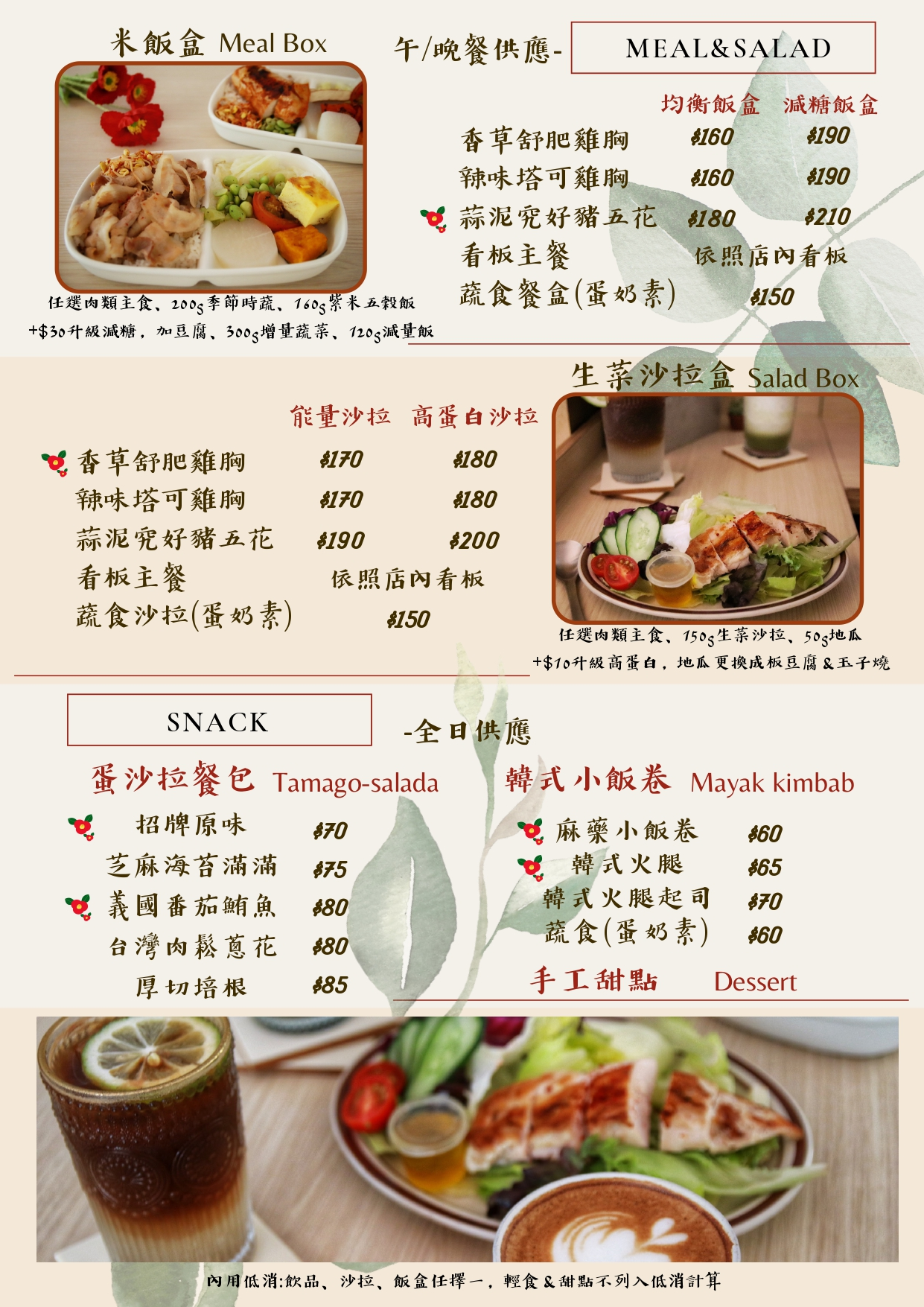 🍛套餐包含:美式咖啡/谷芳金萱 二擇一、小份綜合沙拉(蜂蜜檸檬油醋醬)、蒸地瓜、玉子燒、手工餅乾。