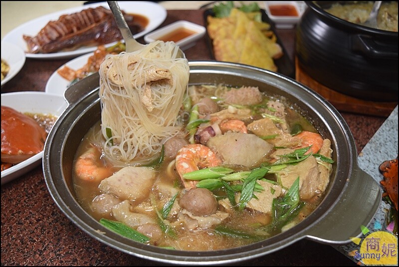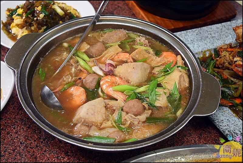 這道米粉湯滿滿一大鍋,鮮蝦、中卷、豬五花、丸子、芋頭、豆皮、櫻花蝦…料超多。