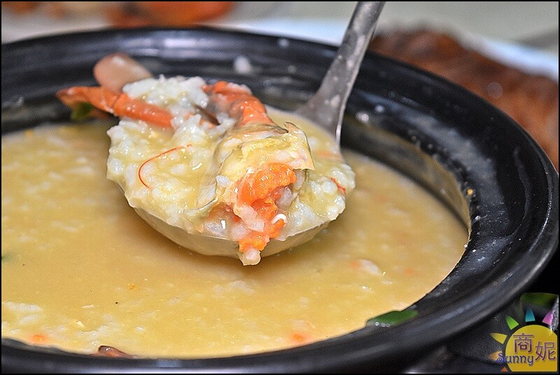 每隻蝦子都有對切讓蝦膏融入海鮮粥當中增添鮮味,海鮮粥湯底加了烤過打碎的堅果,再用豬大骨湯慢慢熬煮生米,再加上鮮蝦及紅蟳,這樣的海鮮粥整鍋都是精華。