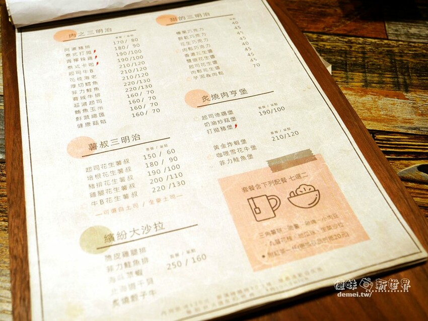 手工漢堡、肉之三明治、甜的三明治、薯叔三明治、炙燒肉亨堡、繽紛大沙拉,