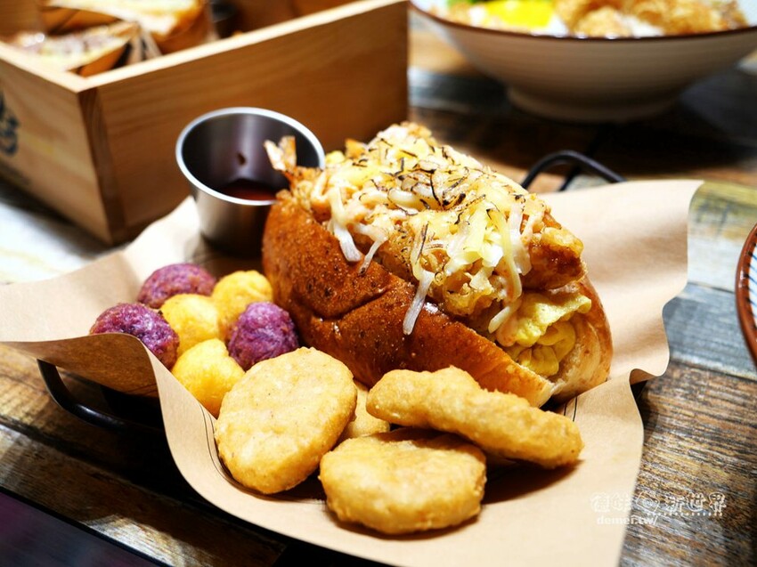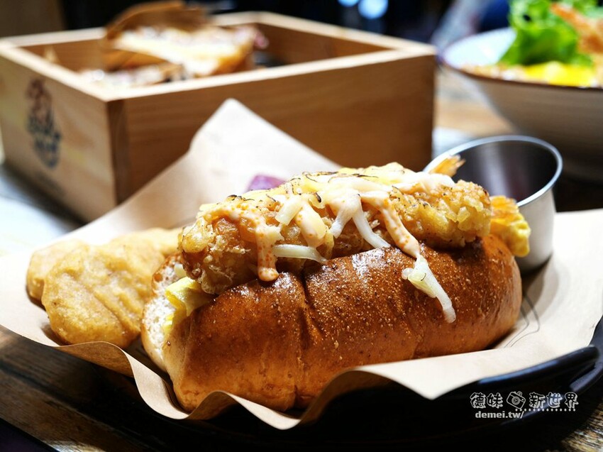 德腸大亨堡常見、但麵包上改放大尾炸蝦還炙燒、淋上明太子醬就較沒吃到,