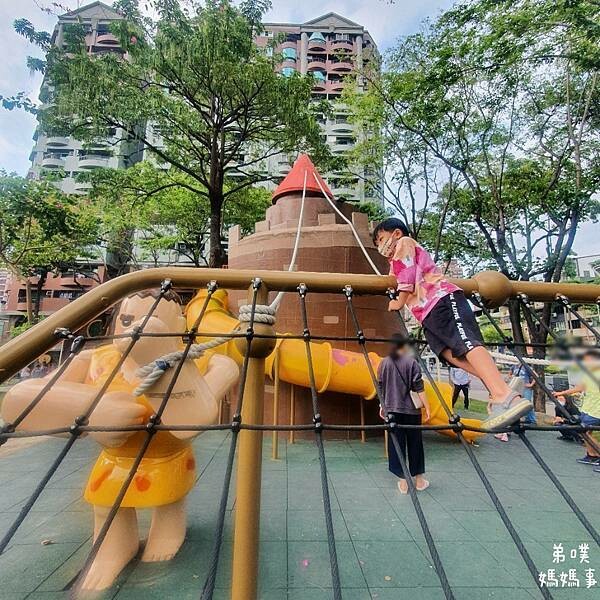 滑索現場是無法使用的,比較有趣的是還設置彈簧床,讓孩子跳跳跳的往前不擁擠。有挑戰性的攀爬網,這個還沒玩到我們就離開了。雖然這邊主要遊具只有兩座,但遊具的豐富度和挑戰度都有,孩子會願意一直玩。要提醒的是公園目測沒有公廁,如要廁所可能要到對面的河堤圖書館。