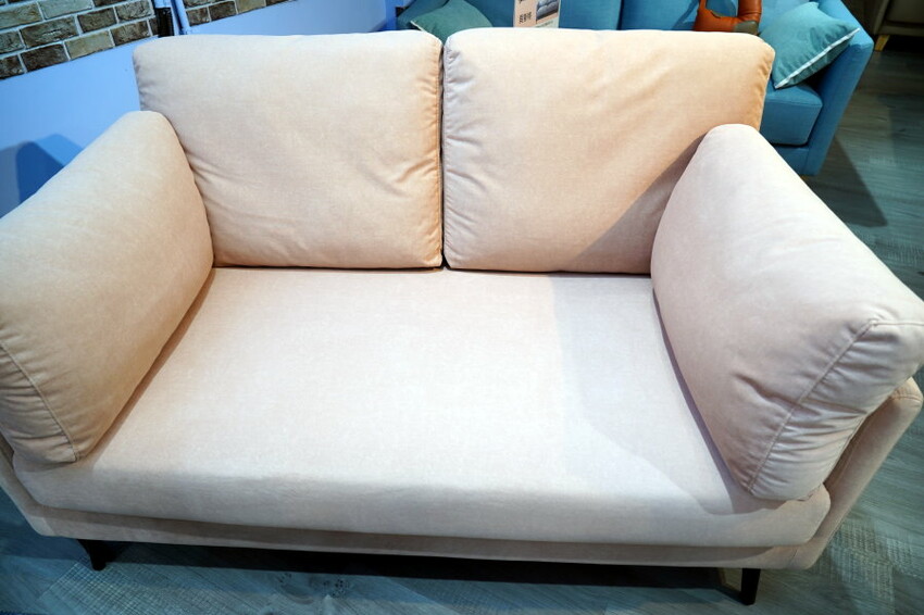 ▼採用高密度泡棉搭配進口皮帶,現場搭配的是貓抓布(也可換成涼感布),摸起來帶點滑溜的絲絨質感,坐上去也很舒適!這張沙發深度只有88公分,相較於一般沙發動輒90公分起跳,所以特別適合擺放在小套房、房間內或是小客廳等小空間使用!