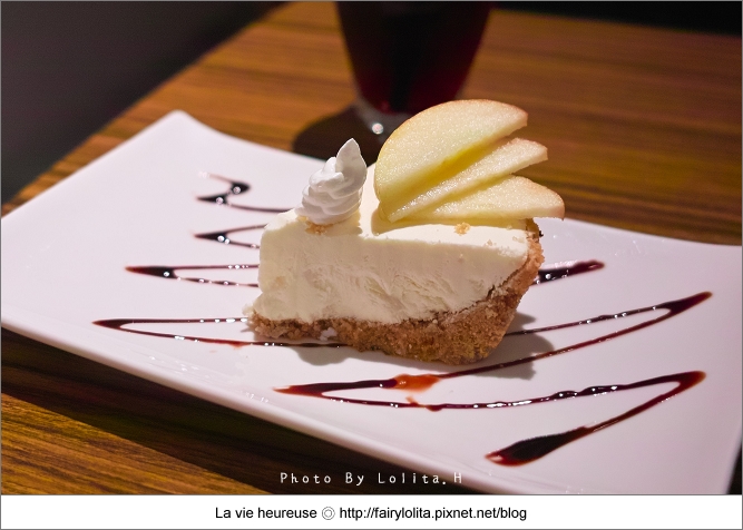 外表看起來像是剛從冰箱拿出來的冷凍模樣,要說它是蛋糕,其實更接近冰淇淋的口感,淡雅的檸檬香氣怡人,融和入溫順奶香,酸度並不太明顯,搭上不油膩而爽脆的派皮,滋味著實有美味到,我們兩個人都挺愛這道甜點的說!
