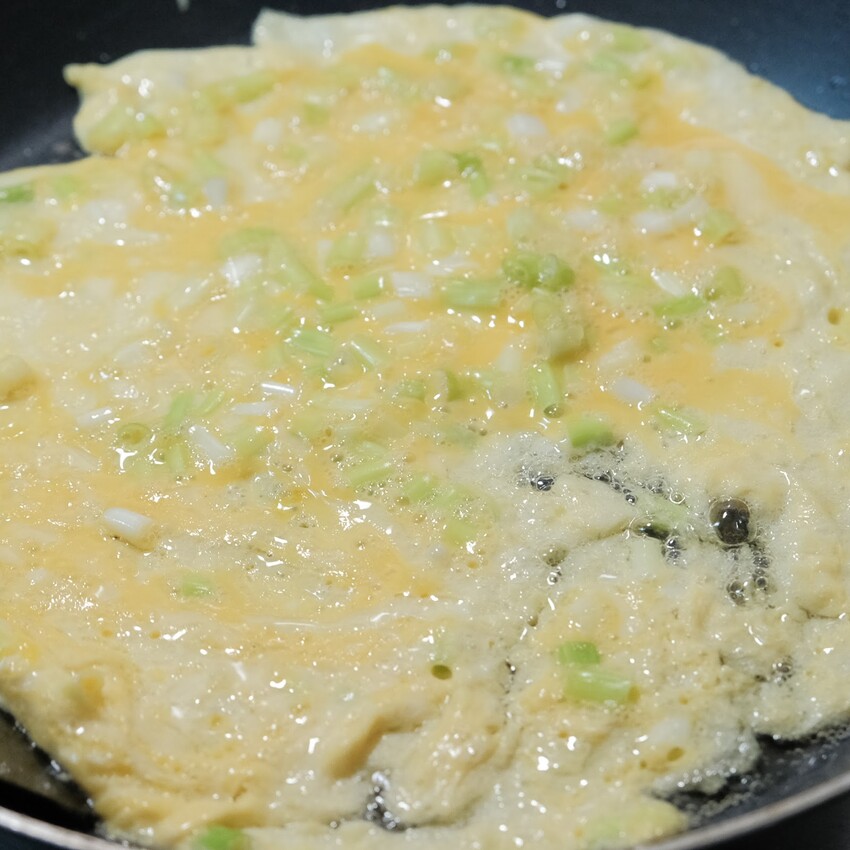 起鍋燒油,把蛋液倒入平底鍋,