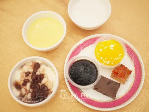 芒果奶酪、蜂蜜龜苓膏、紅豆糕。