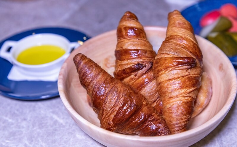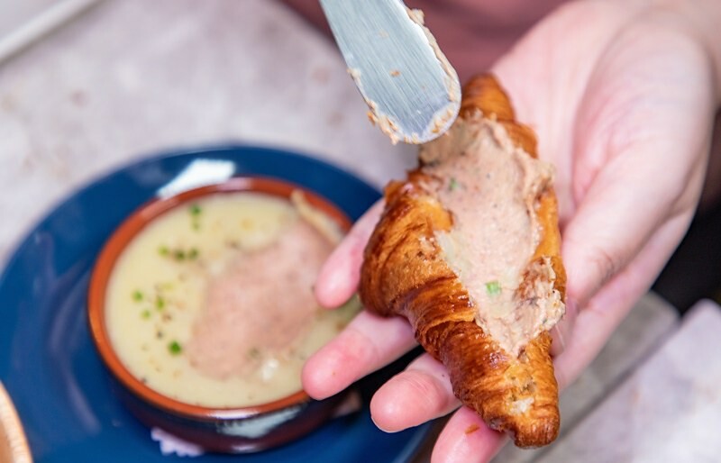 雞肝醬往油酥的可頌裡塞,光是視覺效果就讓人覺得邪惡,一入口那種截然不同的油香,那麼那麼那麼合拍的一前一後在嘴裡化開,雞肝醬渾重的肉香似乎被可頌的麵包油香給柔化了,比之抹在法棍上的吃法,我更喜歡多少數倍,好吃的亂八九糟!
