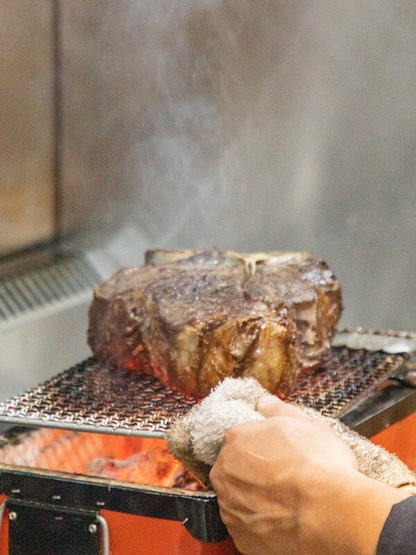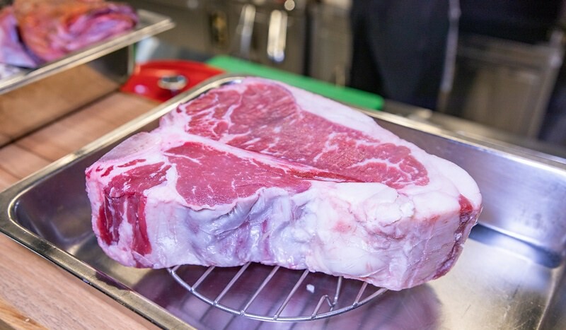 師傅熟練的把厚厚的丁骨分成菲力牛排和紐約客牛排。