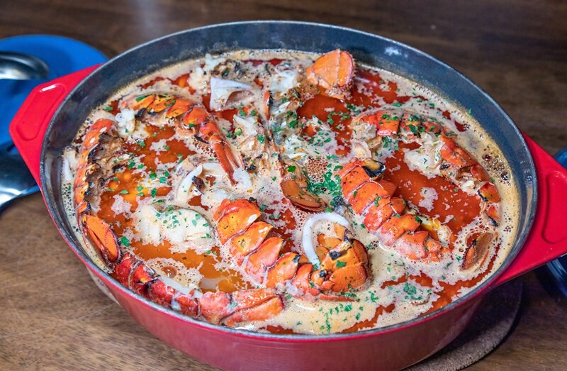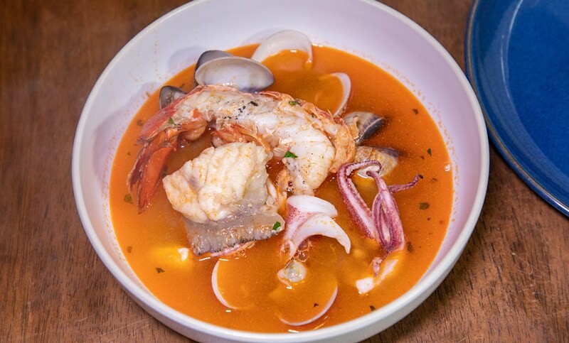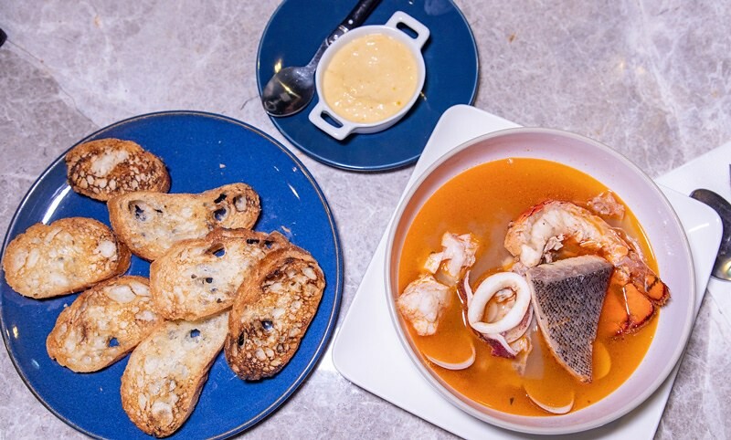 馬賽魚海鮮鍋的龍蝦、透抽都要先烤出其香,再熬進魚湯中。