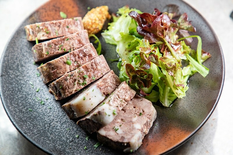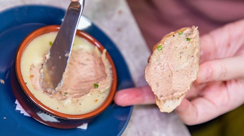 開場是自製肝醬、冷肉醃菜盤,這點從塞子就一路如此,可以喝點白酒、香檳倒上一杯,三五好友邊吃邊等待主餐上桌。