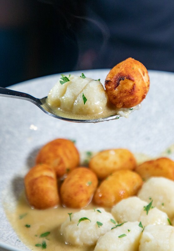 手工麵疙瘩醬汁和剛剛的燉雞肉有異曲同工之妙,油香之餘兩種麵疙瘩軟綿的口感也讓人喜歡,尤其是帶著油炸酥香的炸麵疙瘩,有著讓人印象深刻的美味。下次單點上一盤,我可以。