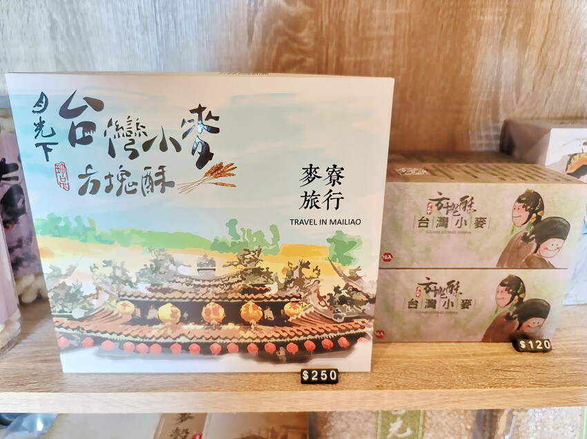 老闆敘述,方塊酥外盒上有兩個不一樣的圖案,左邊是麥寮的國定古蹟「拱範宮」媽祖廟,有337年歷史;右邊是台糖原料辦公室的,那時候我聽到台糖原料辦公室的故事,就想把它放上外盒,讓客戶看到會想來麥寮走一走。