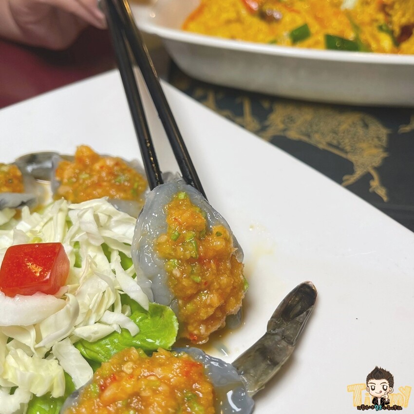 生蝦上淋的是傳統泰式辣醬,辣度還挺強的,配上鮮彈的蝦肉,真是酸辣有勁