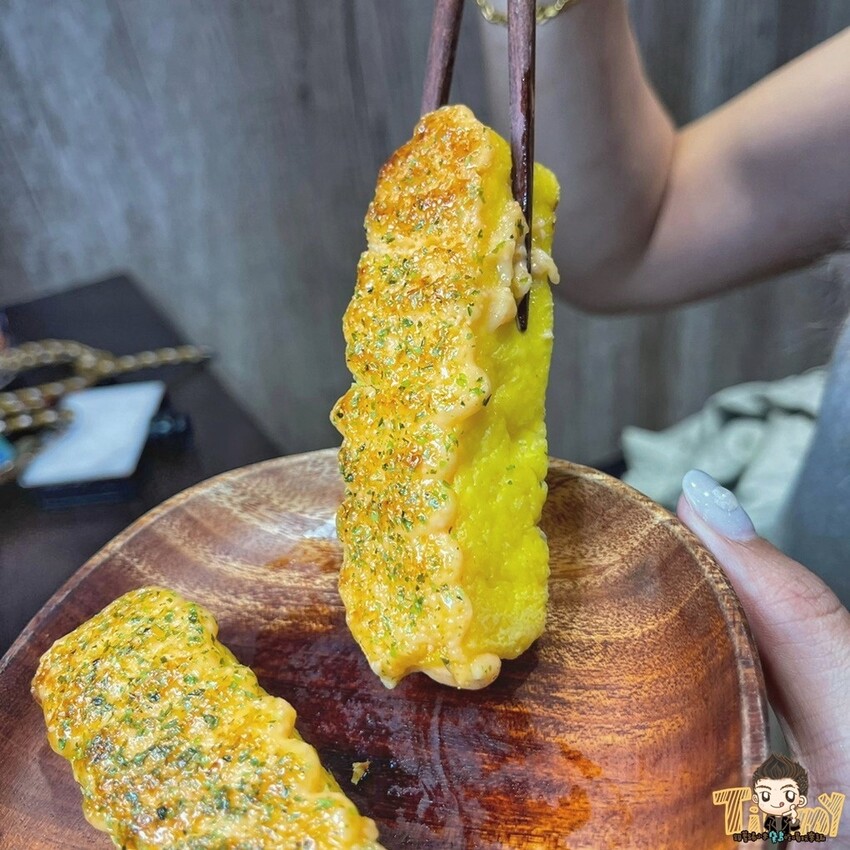 明太子玉子燒 (120元),在厚實的玉子燒上炙燒明太子沙拉,吃起來有脆皮帶點紮實的口感,是偏甜的蛋料理。