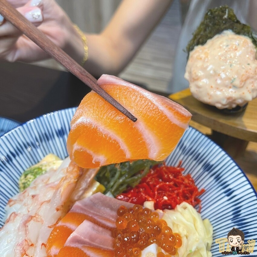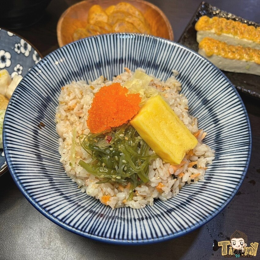 燒烤過的挪威鮭魚跟米飯、魚鬆、橄欖油及特製醬汁拌勻,再加上蝦卵、小菜及玉子燒,價格也相當親民