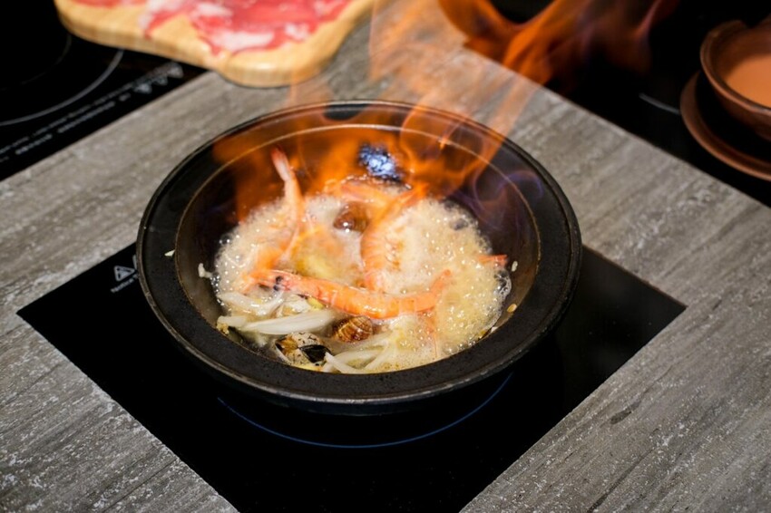▼最新推出的火焰燒酒蝦湯底,上桌後由店員到桌邊進行拌炒,首先以香油以及麻油煸炒底料,再倒入紅標米酒再進行點火灼燒,最後倒入自家熬煮的昆布湯頭,料理過程同時滿足味覺嗅覺的享受~