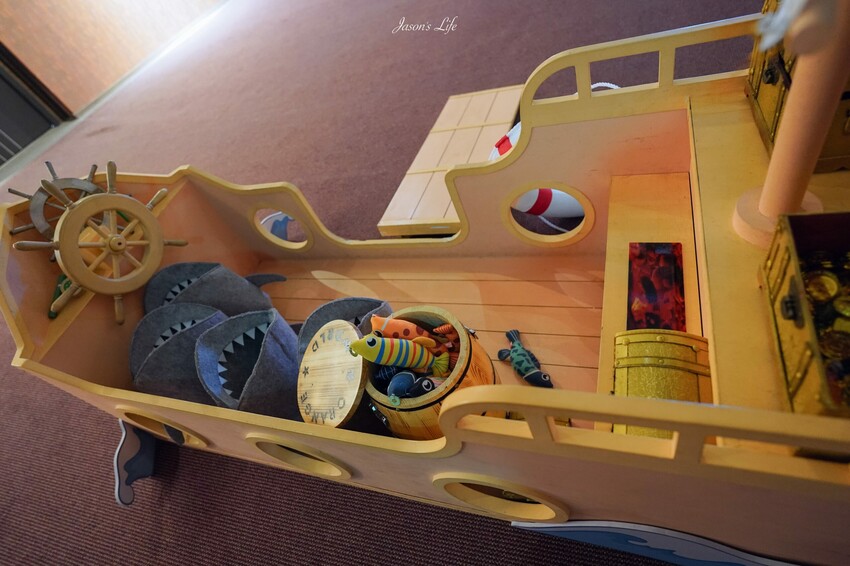 有擺放一艘海盜船,甚至有磁鐵釣魚遊戲、寶藏箱等等