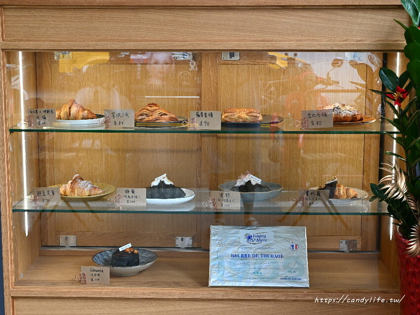可頌口味及價格陳列在木櫃櫥窗中,是說糖糖前一天忘記預訂,很怕來買這天會有很多口味撲空,所以店家一開門就來卡位,好險早起的鳥兒有蟲吃(明明開門時間已經是下午兩點XD),這天來口味超齊全