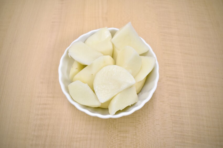 《馬鈴薯鮮乳料理步驟1》把馬鈴薯切成塊狀用電鍋蒸熟,或是水煮(中火約10分鐘),程度大概是筷子可以輕鬆的穿到底就可以了