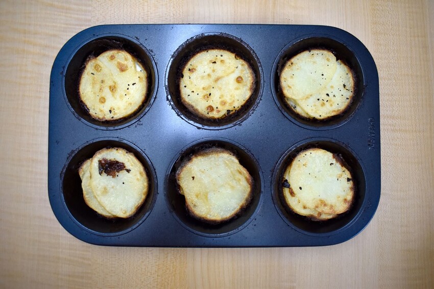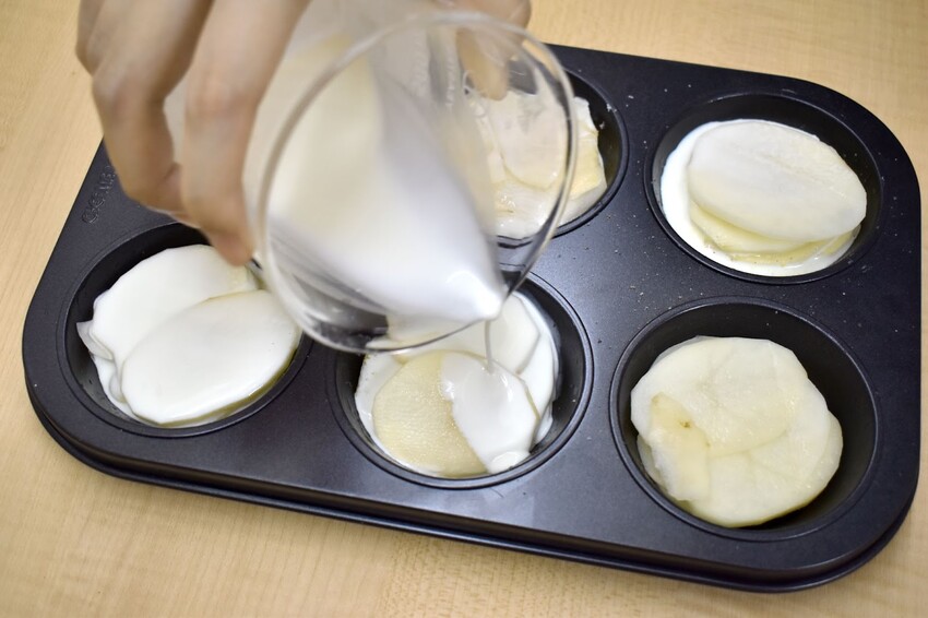 《馬鈴薯鮮乳料理步驟4》可以先將烤箱預熱約200度,等到吸收的差不多之後,將烤箱轉至180度,烤盤放下層或是用鋁箔紙稍微蓋住表面,因為我使用馬芬烤盤所以只需烤25~30分鐘左右(如果用一般的可以烤40~50分鐘),最後的10分鐘再將鋁箔紙拿掉,可以避免燒焦!