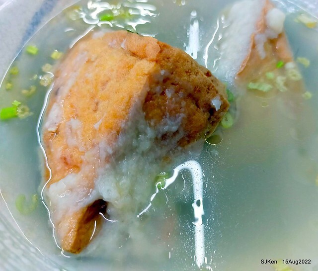 第三道品嚐的是這碗小漲5元的「豆干包湯」(NT$60/碗),只以撒上芹菜末的清湯,來陪襯兩個碩大的三角豆干包,就知道店老闆對自己手做的豆干包手藝有多自信,真正好吃的東西都是吃原味,如果原味好吃,那口感就八九不離十,豆干包的豬肉餡吃起來同樣是香軟紮實,一口接著一口慢慢咀嚼,感受軟中帶勁的豆干包滋味。