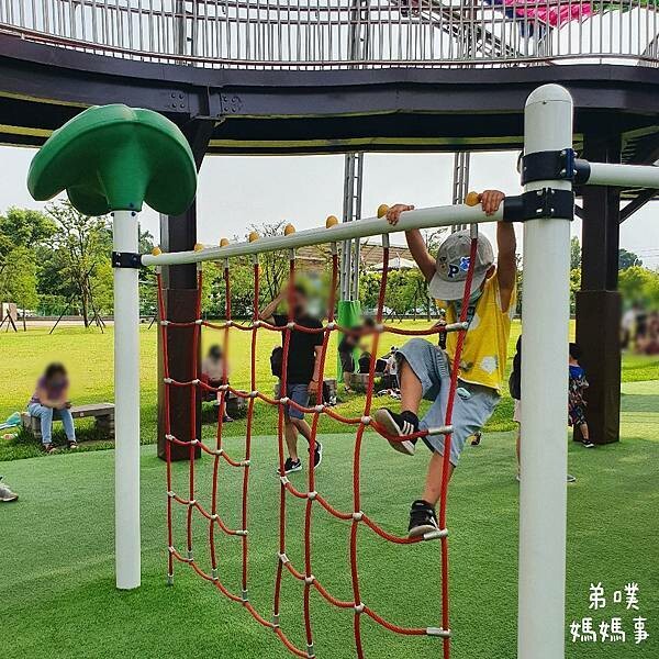 平衡木,弟噗很喜歡玩,不過小孩沒注意的話是很容易在下方奔跑時被絆倒。後方的網繩也很適合大孩挑戰喔!