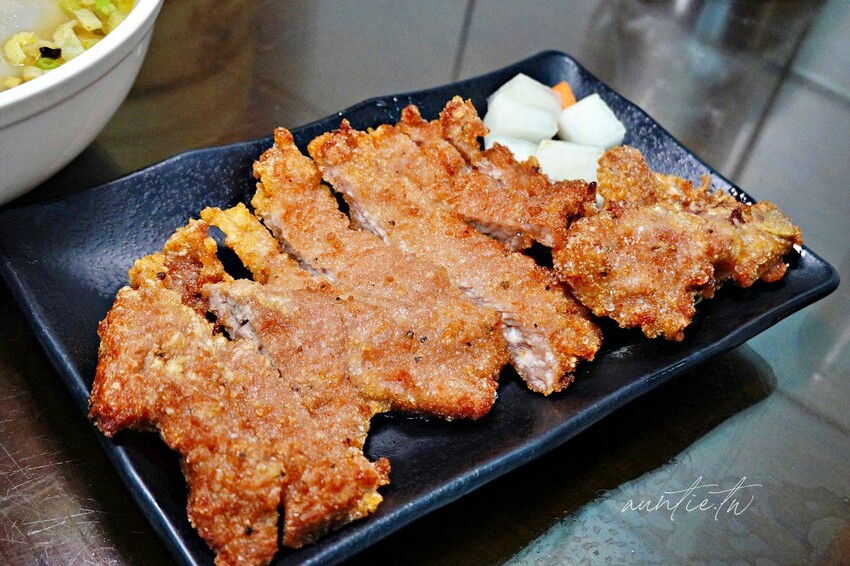一旁還搭配著醃漬蘿蔔,搭配起來吃會更解膩些,因為菜肉餛飩湯口味也頗重,所以有蘿蔔泡菜換換口味也還不錯。排骨醃漬的味道很不錯,現炸香噴噴,算大片但是單一片排骨就要100元,實在是有點金貴,還好味道不錯吃,但是也沒到超厲害的地步,但是來到這就會莫名想點上一塊解解饞,莫名的被制約住。