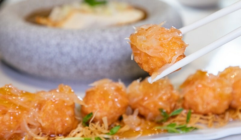 柚蜜金蝦丸是本季以台灣水果入菜的新料理,湊近一聞便是蜜甜柚香的氣息,柚子的透亮和金色的蜜汁多少也會這道傳統的炸蝦球添上喜氣,入口是蜜甜、柚香交錯,咬下是皮酥蝦Q,柚蜜的清爽為帶點湯汁的蝦子鮮甜舖好了咀嚼端,那酸甜油香鮮細細風味。