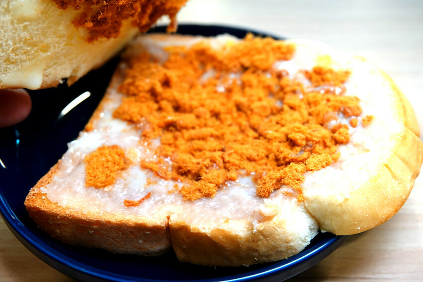 鮮乳吐司舖滿芋泥、灑上肉鬆,點綴一點煉乳,就完成了。