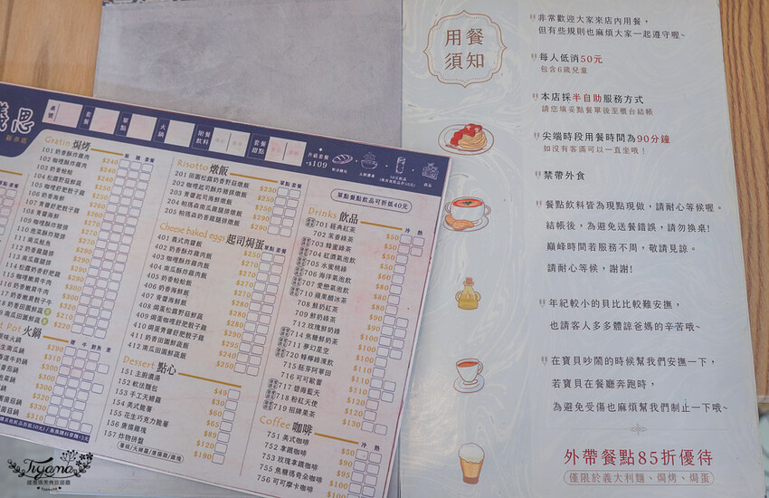 客滿時用餐時間為90分鐘,外帶享有85折的優惠。