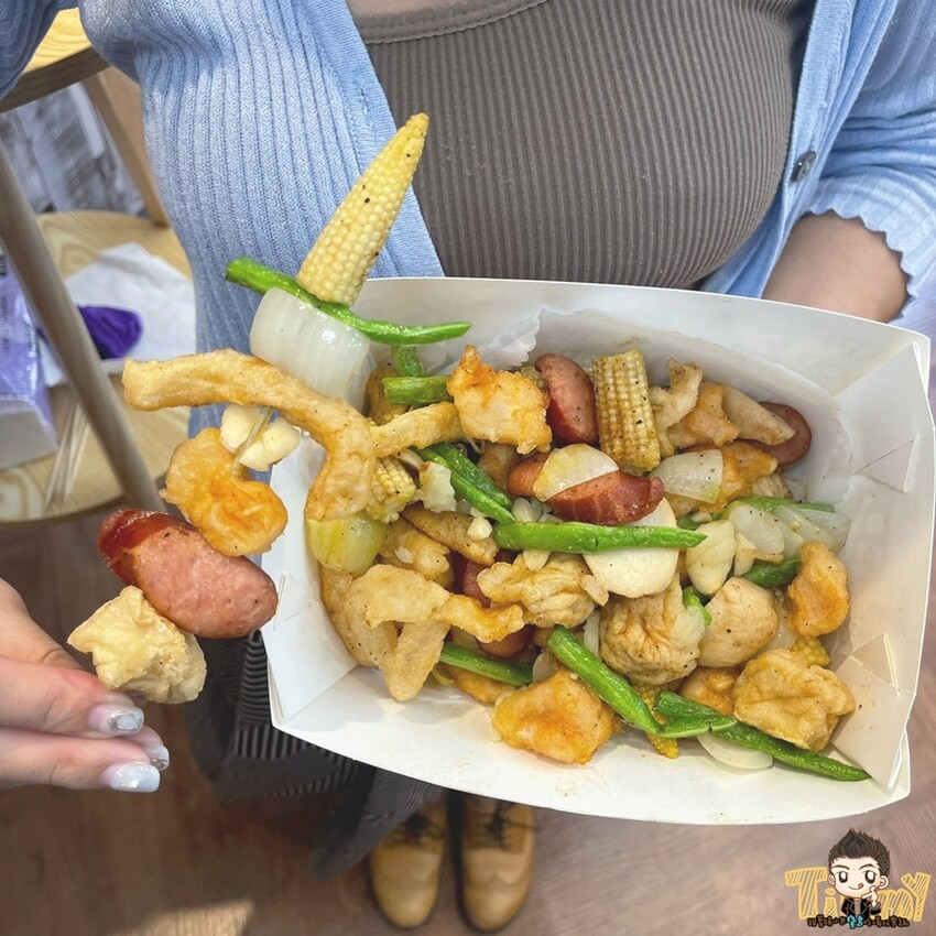 除了炸洋芋片外,另有現炸嫩雞、德國香腸、甜不辣、四季豆等不同炸物可以選擇,特別的是炸後會加入洋蔥、蒜頭增添風味
