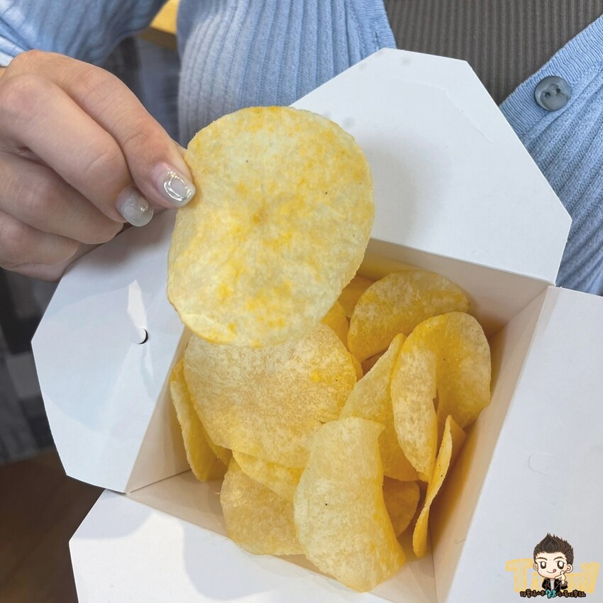 整片馬鈴薯不用裹粉,直接油炸,吃起來除了有酥脆的口感,跟市售洋芋片不一樣的是,還多了馬鈴薯自然的甜味耶!
