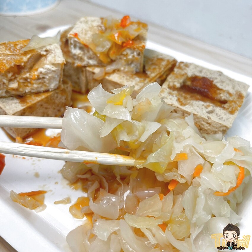 現點現炸的臭豆腐,酥脆外皮、內裡軟嫩的口感,搭配脆口清爽的台式泡菜,再加上一碗小腸豬血湯,就是最經典的台式宵夜了