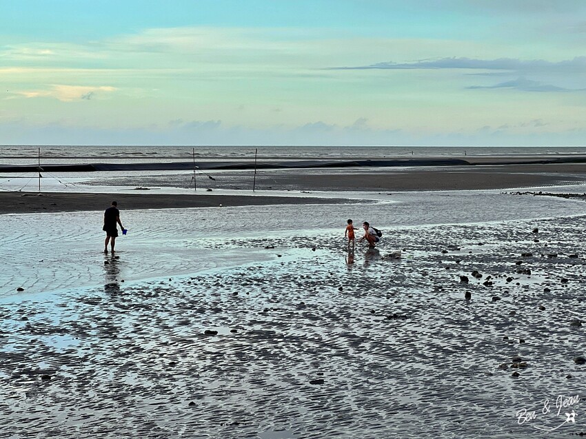 這裏海灘平坦寬闊,沙質柔細,退潮時露出綿延數百公尺的大片沙灘。 小朋友挖挖沙找找螃蟹,還是玩得很高興