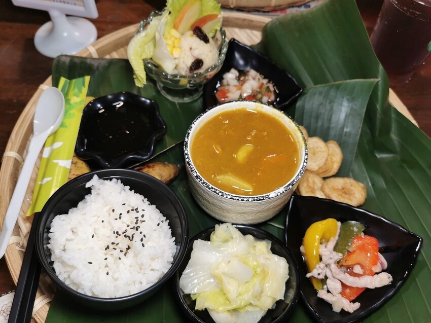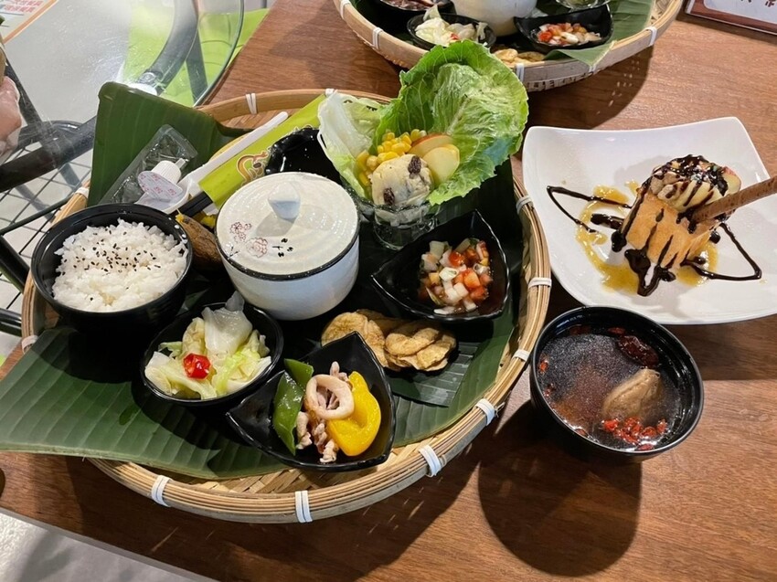 跟各位簡單介紹一下,特色餐都有用山蕉入菜,餐點有用熟香蕉也有用未熟成的青香蕉,工作人員說青香蕉有不同的營養素,而且口感很適合用來烹飪,有加入香蕉的馬鈴薯泥,還有塔塔醬搭配蕉叔薯(就像歐式餐廳的前菜小點心)以及藥膳湯裡面吃起來超像山藥的,是青香蕉喔,真的是一不小心就把香蕉吃了,完全顛覆了香蕉只能剝皮吃的觀念呢。