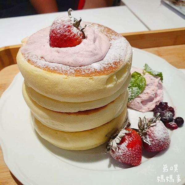 來這裡弟噗媽推薦必點的就是這個讓弟噗看得超開心現做的"北海道十勝特厚三層舒芙蕾鬆餅",而且連鬆餅糊都是現場調製。這三層真的很厚,是雙層再疊三層,大概就是六層的概念阿~~~~媽媽我看得也是現場超HIGH
