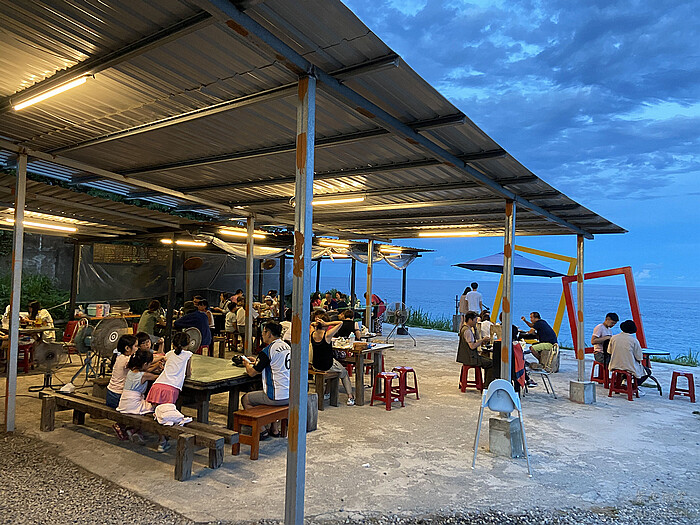 雖然鐵皮屋外觀的餐廳建築看起來不太起眼,但這樣也好,這裏吃的是美食不是裝潢!! 樸實自然,感覺穿個夾腳拖就好。反正一旁的太平洋無敵海景,真的是五星級的景觀啊。傍晚時分海風徐徐吹來,真的很棒呢