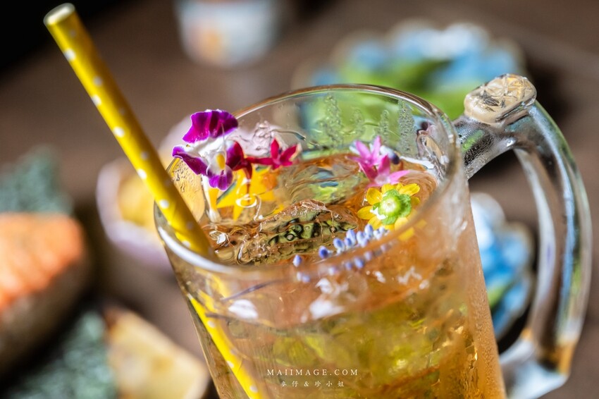 ▲整支冰棒直接插進Highball裡好療癒,旁邊擺滿食用小花看起來更賞心悅目。這杯的喝法你可以把冰棒就這樣放著,讓融化的冰棒跟highball結合,帶著甜度的威士忌更適合不喜歡酒味的朋友品嚐,珍小姐就是其中之一,完全對中她的口味,但要小心雖然甜但還是有酒精成分,所以不要過量囉。