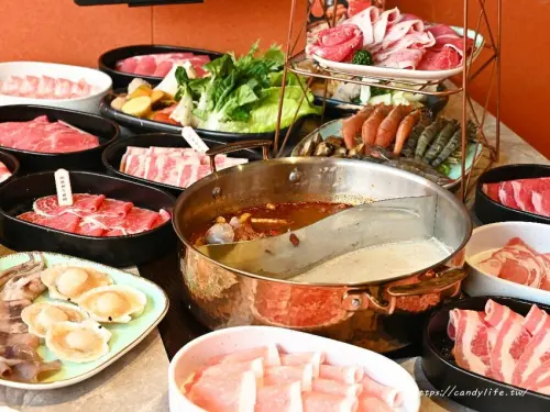 鴛鴦鍋湯底的部分則有5種湯底可以選擇2種,像是蒜香老母雞湯、養顏番茄湯、蕈菇蔬菜湯、嚮辣有骨氣麻辣湯和粵式胡椒豬肚雞湯,其中麻辣湯與豬肚湯是需另外加價的喔~