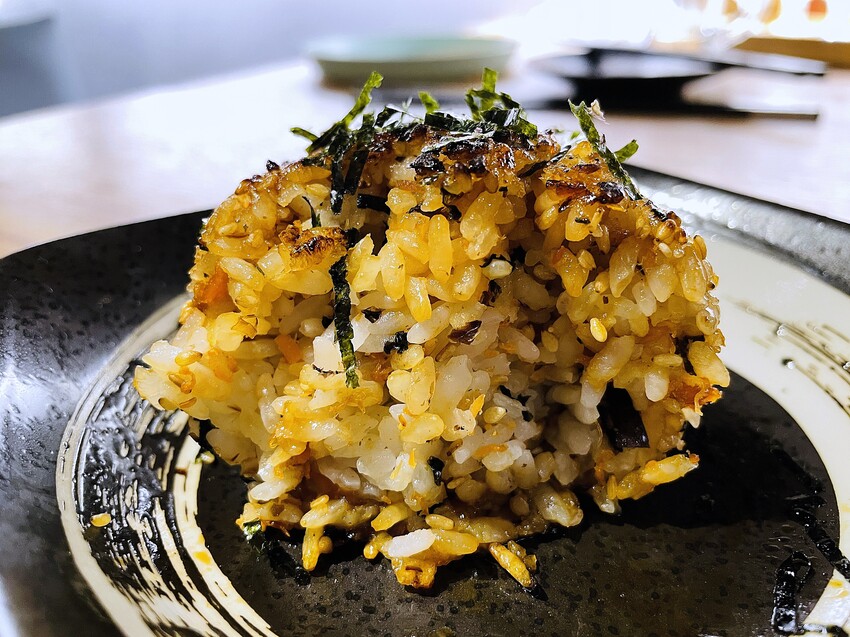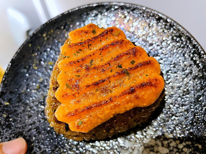 明太子飯糰米飯經過火烤外層變的微微硬脆焦香迷人搭配靈魂明太子醬風味更添層次~