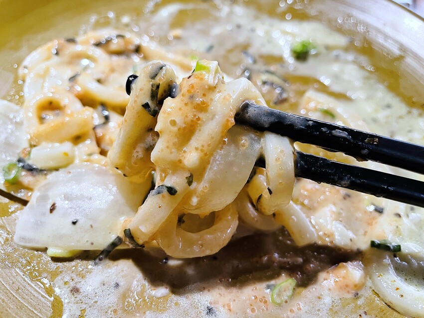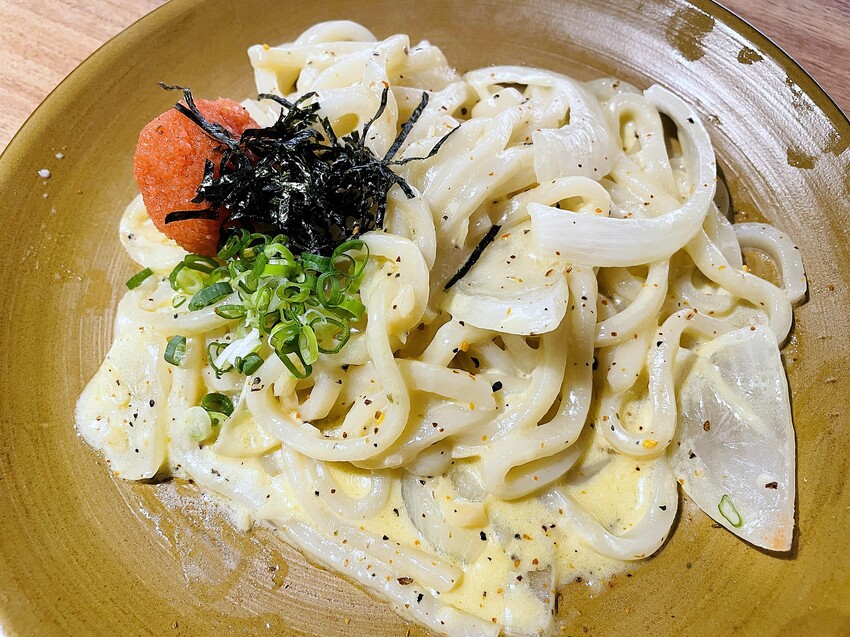 明太子奶油烏龍麵滑溜麵體吸附濃郁奶油醬汁