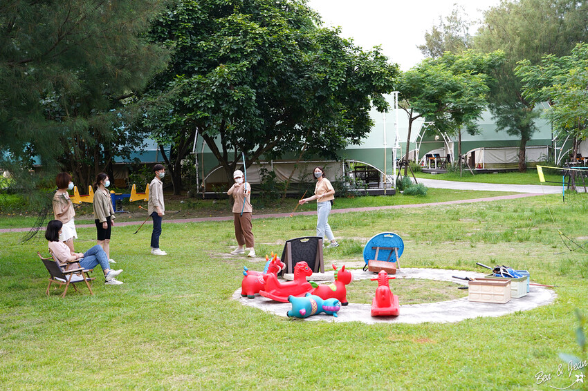 除了營帳外,這裏也有寬廣的大草池,上面有一些遊樂器具,還滿好玩的。入住這裏可以享用下午茶、晚餐、早餐,一泊三食的免裝備豪華露營,還可以走到海邊欣賞浪漫的夕陽及無敵海景,真的太棒了