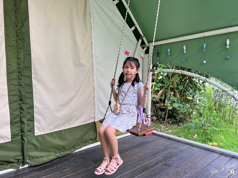 沿著風車大道的兩邊都是帳篷區,有不同大小跟房型,(可以參考一下官網)每一個帳篷外面都有自己的盪鞦韆跟木桌椅!